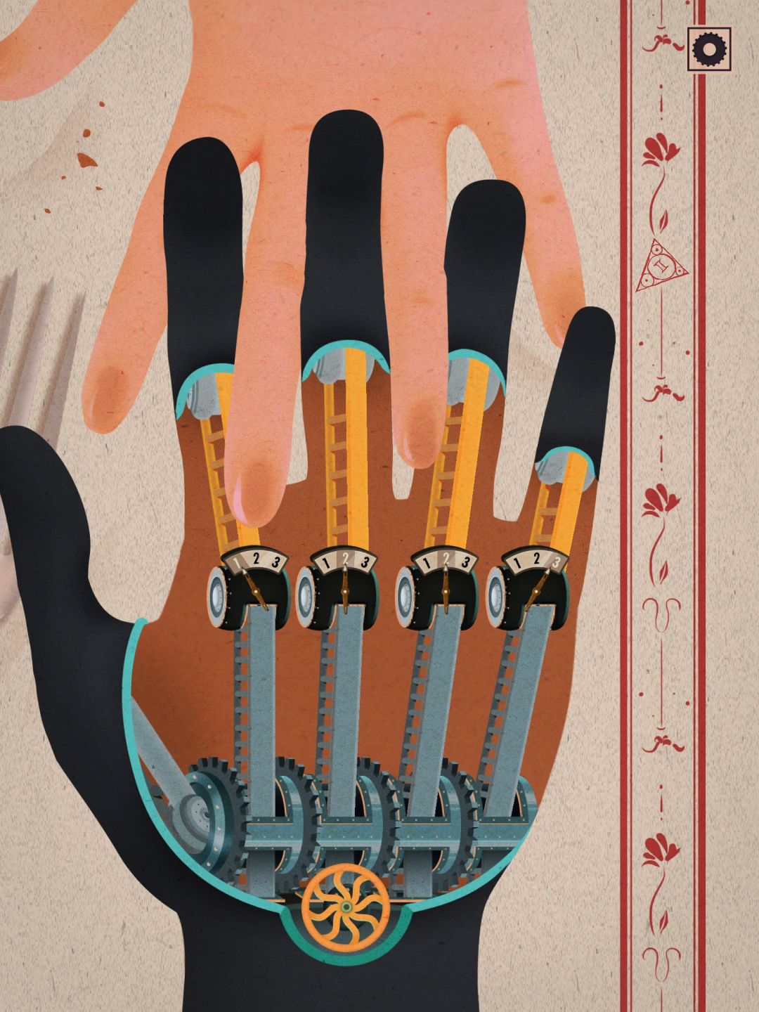 这个部分模拟的很有意思,分别是切断食物的铡刀(对应门齿),切碎食物的剪刀(对应犬齿),以及磨碎食物的磨(对应臼齿),把人类牙齿的各部分功能对应的很清楚