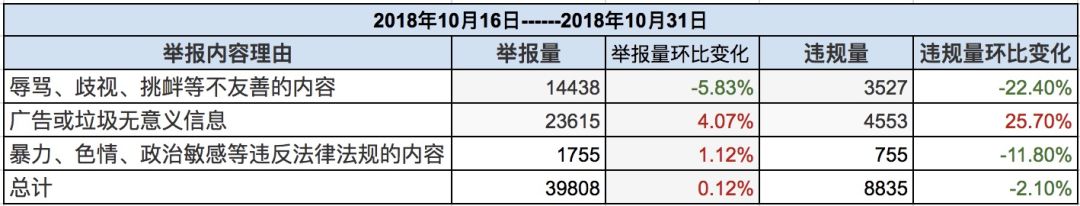 十月后两周总举报量同比无大幅明显变化,总举报量39808条,换比增长0.12%,举报实际处理量8835,环比减少2.1%,举报成功率22.2%,也无明显波动