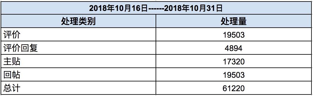 十月后半月内容总处理量为61220条,平均每日处理内容4081.3条,环比小幅增长,本期违规主贴处理量增长明显,其他条目无大幅明显变化。