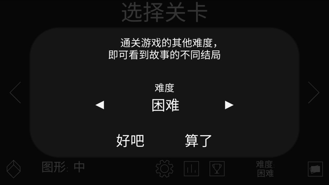 目前游戏的55 个关卡、三种不同级别的难度配合三个结局都让游戏变得很耐玩,游戏从一开始就告诉我们要有耐心,难度的级别是通过小红点距离机关的远近体现的,简单难度则不用离很近就能触动机关。