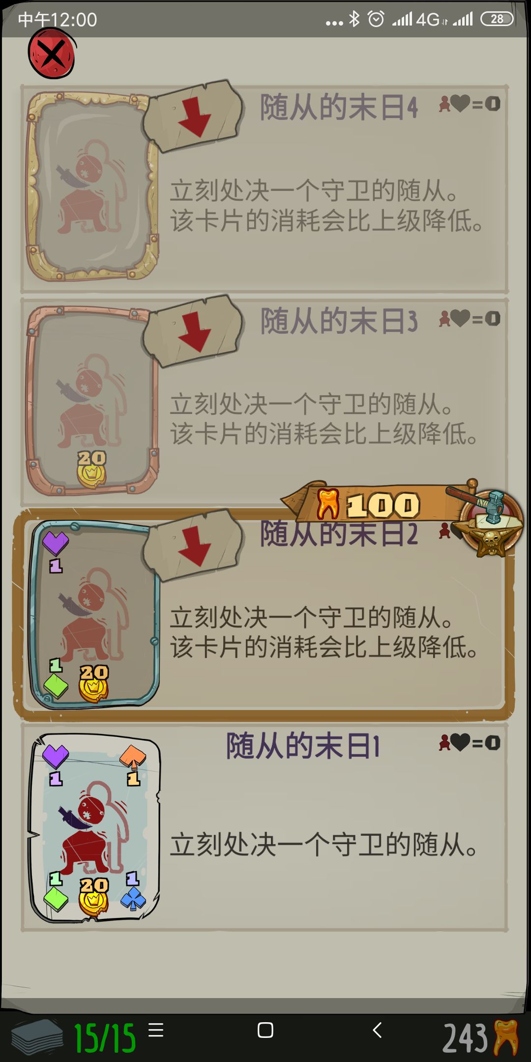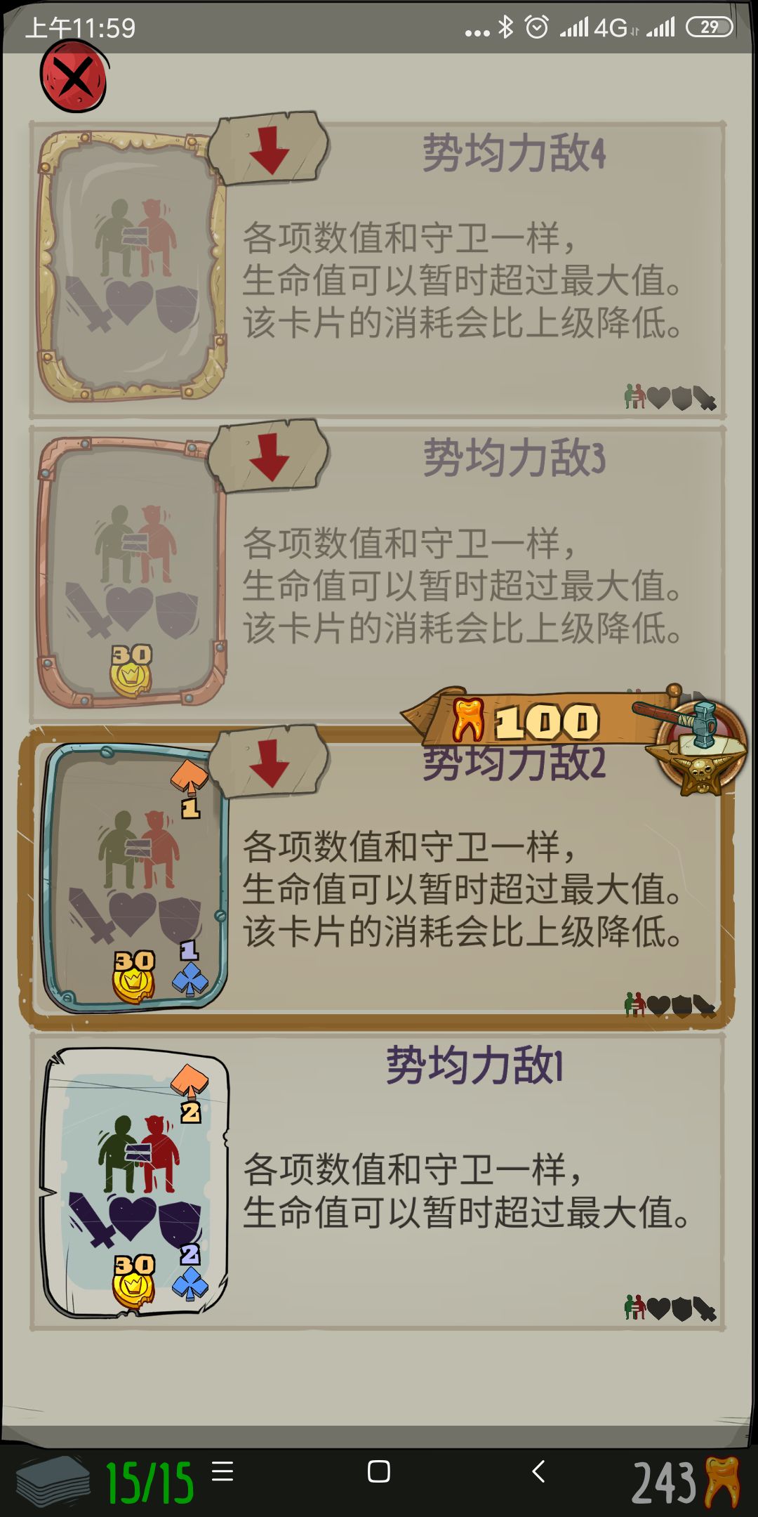 然后就是4色资源,需要解锁,这张牌也是我第一张升到顶的牌,有了它,每回合只要抽到都用,资源不愁。接下来就说到战斗了,战斗的核心思想就是不要让大怪摸到你,无法秒掉的大怪,主要靠这几张卡无伤