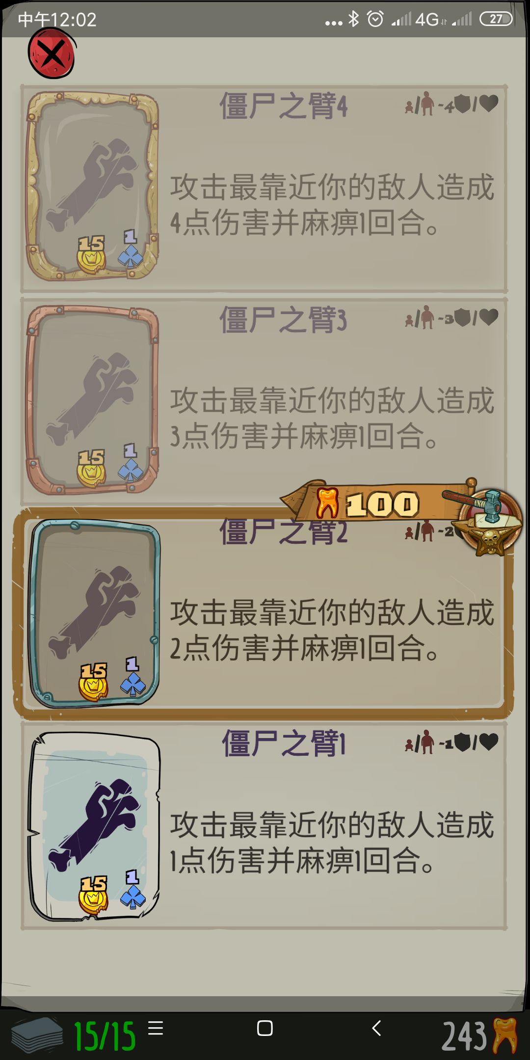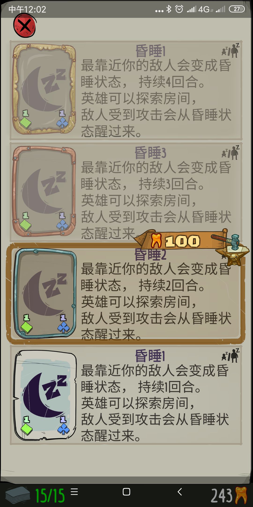 游戏有催眠和麻痹两个机制,催眠是不被攻击你可以继续翻格子,一旦被攻击就醒,战斗中翻格子没什么意义,所以催眠一个回合和4个回合没什么区别,没必要升级。然而麻痹则不一样,麻痹的回合数是对面被攻击也无法攻击的回合数,麻痹数回合也就可以白打对面数回合,所以麻痹这张卡就是无伤打怪的主力,可以升级,僵尸之臂升级只加伤害不加回合数,不用升。qiang