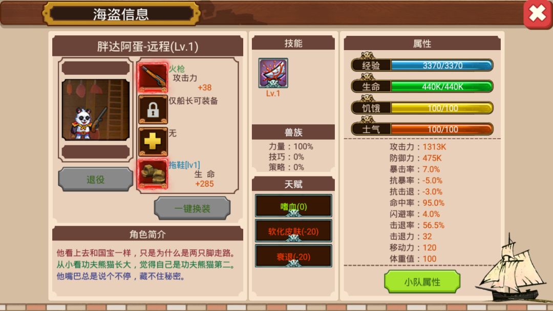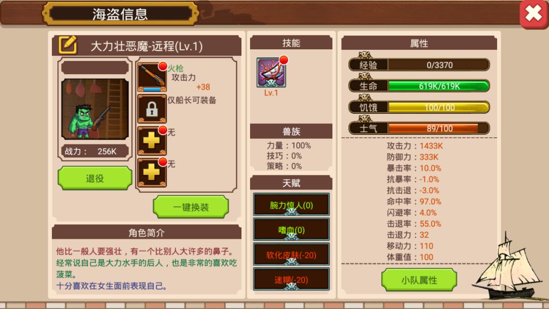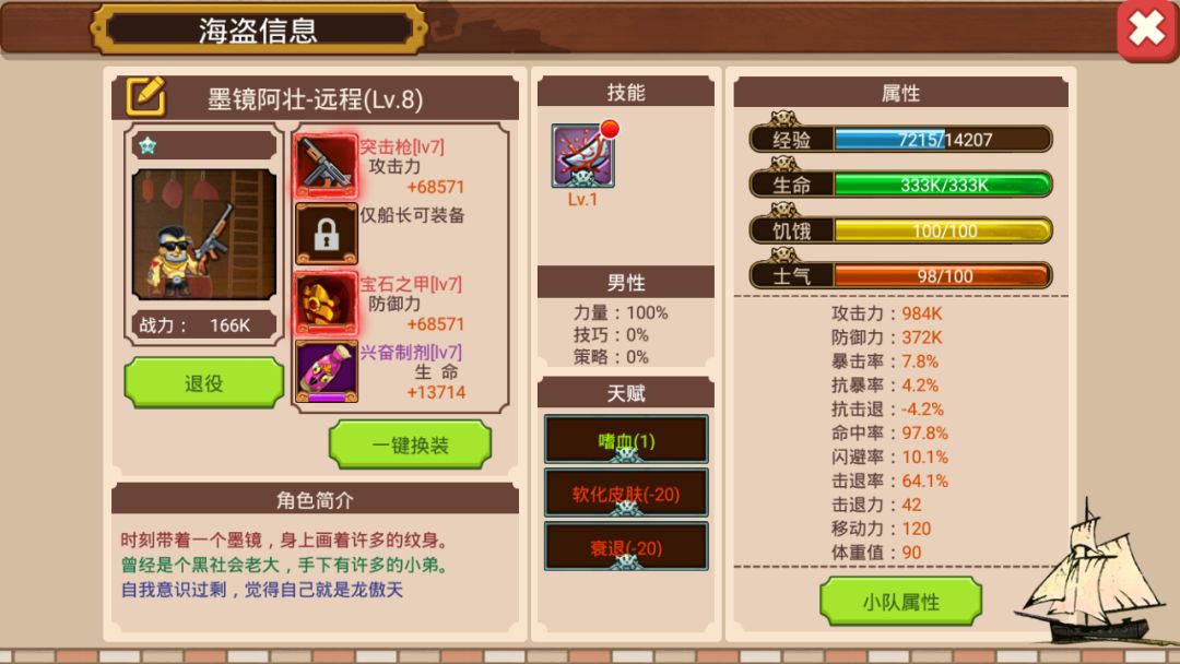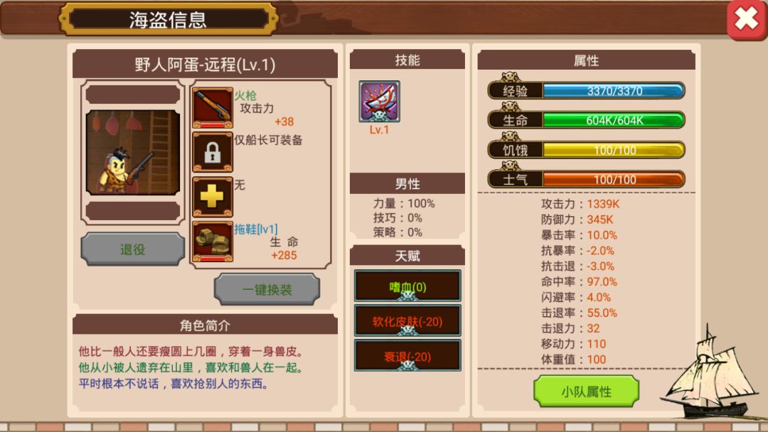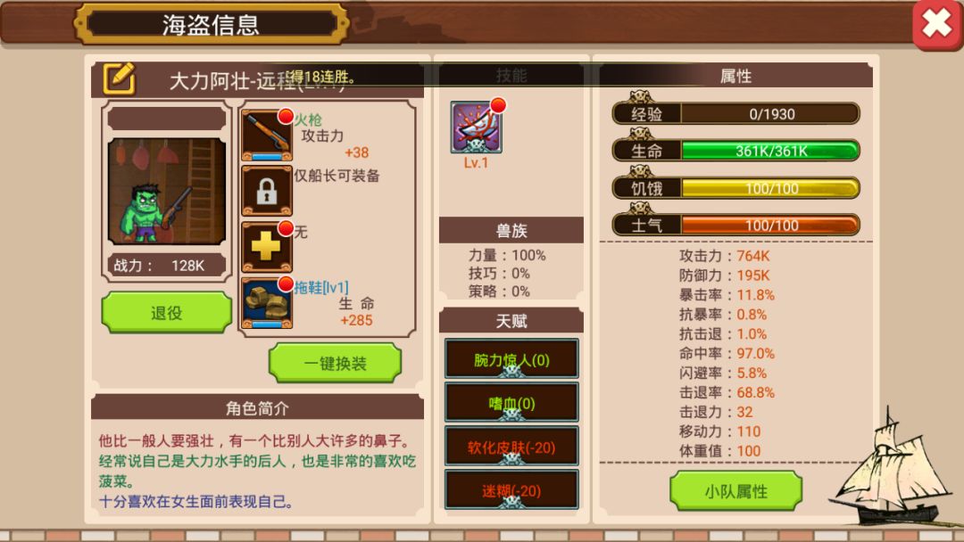 因为新招募的野人阿蛋肯定是1级,所以我必须把大力阿壮还原成1级。我先把他卖了,又回菠萝海招募了他(辛亏传奇海员是原价返回的,不然这个测试我都做不下去)。下图为1级阿壮的属性面板(不好意思,这里有双+285的破鞋子没有脱掉,影响不大)。可以发现,1级跟7级之间战力相差了24K,攻击力相差了120k(远程角色的最高属性为攻击力)。