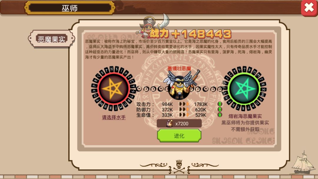 4.恶魔化后失去了七武海的属性加成(大力壮恶魔不是大力阿壮,已经不算在七武海范围)。这一点很可惜。因为我没能恶魔化全部七个人,不确定是否有恶魔化的七武海加成,当然理论是没有的,因为没有任何游戏提示。