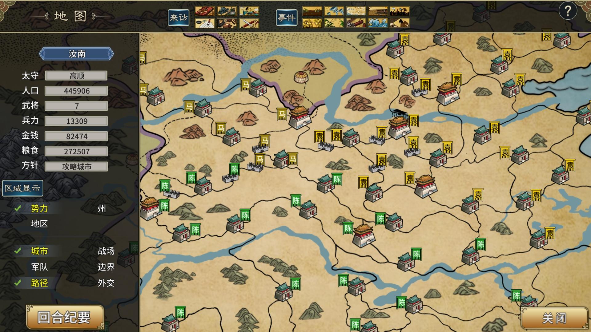 这个档的曹孙刘都好惨,曹老板不知道为什么一直打不出去,本来第一年还吃了汉国,我还以为在乐浪种一会田就会被曹老板锤的。。。然后他就被打下了西北的袁绍收了。一直欺负严白虎的孙坚居然被他反吃了,严白虎中期也很厉害,打下了江东8个城,但是守不住被刘璋给吃了。大耳贼也蛮惨的,前期一直跟刘表在那耗,然后刘璋强大了,进不了西川,在中原被各方势力围攻后也垮了。