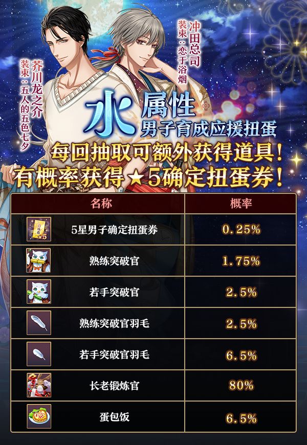 ※ 水属性扭蛋池只能进行11连抽取;※ 水属性扭蛋池出现男子和概率及抽取额外获得奖励的概率,请在召唤-活动扭蛋界面点击图片查看。