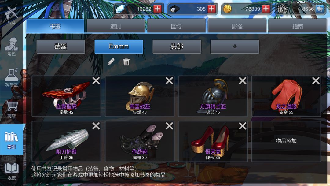 铁矿石合成铁爪铁指虎后就可以丢了,羽毛合成羽翼指虎和面具,泡山参茶和树枝茶,格子吃紧就把沸水丢了,山参留一个做药酒