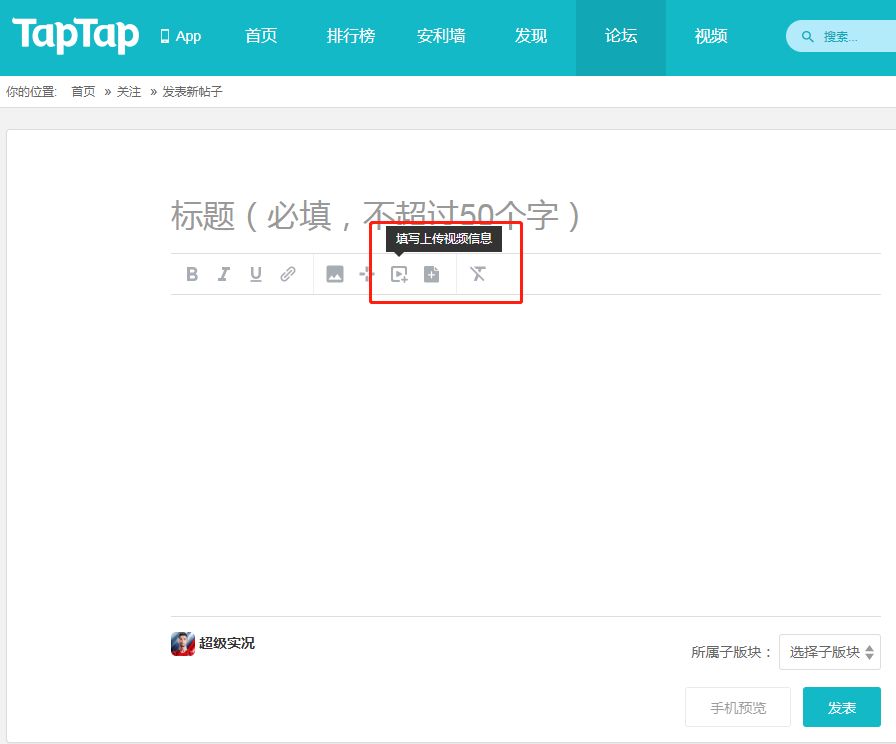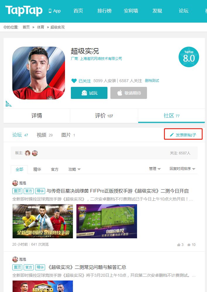 PC端:进入TapTap《超级实况》社区,点击【发表新帖子】,在发布框中选择视频上传。