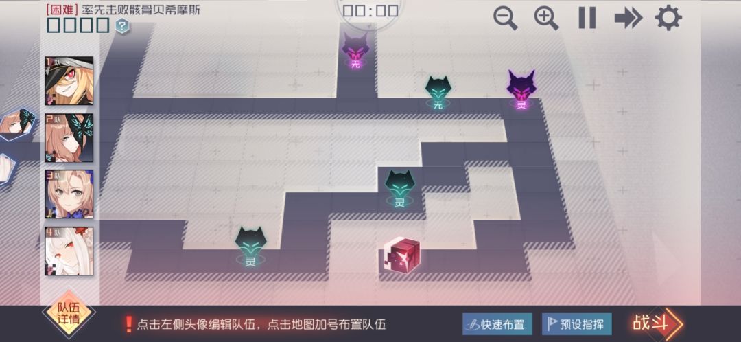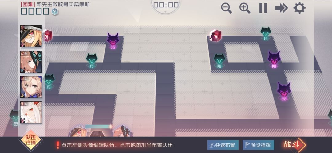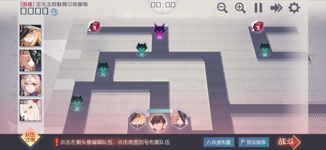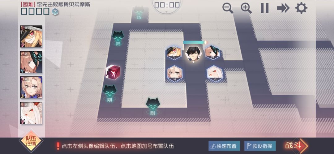 队伍配置主要就是这样,开局位置不重要,一键设置就行,一个斩首队,三个偷箱队。个人比较推荐偷箱队中都带一个辅助。注意点,战斗中切换消耗的能量点无法恢复,战斗中不会掉落加血之类的。开局的时候会有三队敌人骚扰,上巧下刚右灵