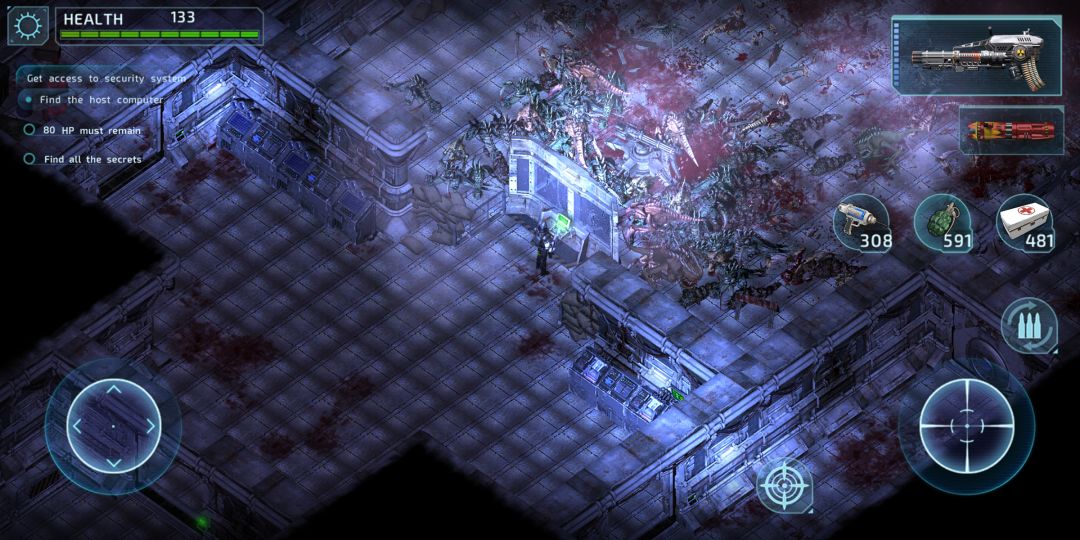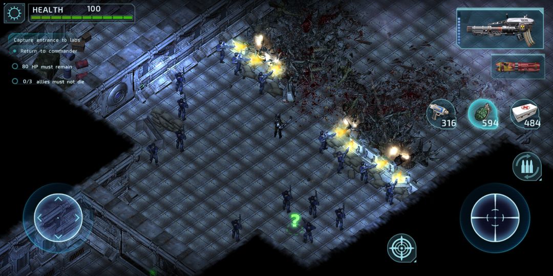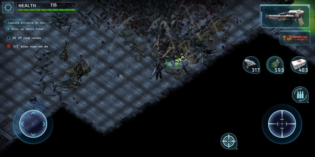 如图,这个画面和风格相信玩过孤胆枪手2代的玩家很熟悉,游戏中的npc,蓝衣机枪兵协助玩家对抗异形大军的作战场面。