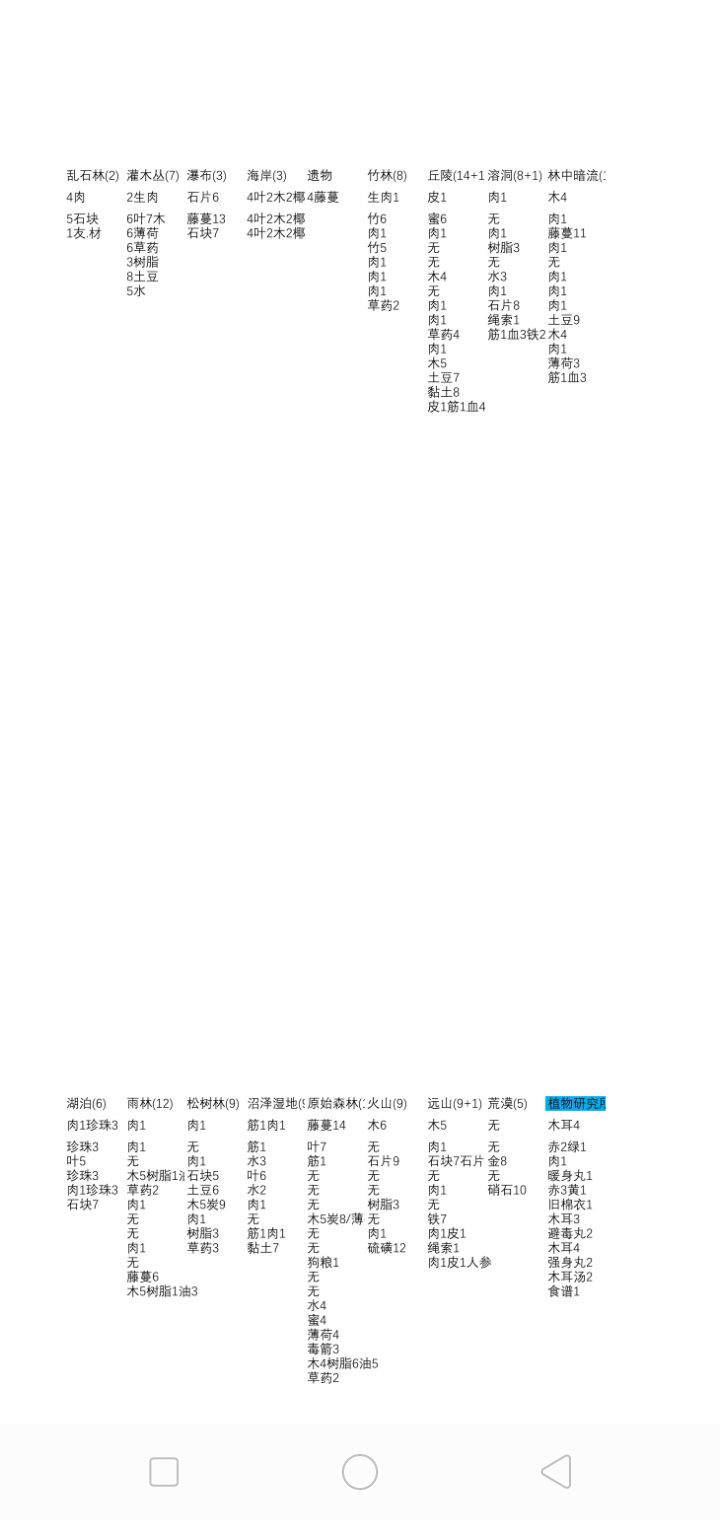 无,木,肉,油,盐,水,草药,竹子,羊毛,藤蔓,木炭,兽筋,蜂蜜,人参,兽皮,铁矿,薄荷,绷带,树脂,珍珠,土豆,石锤,血匕,友.远武,友.近武。