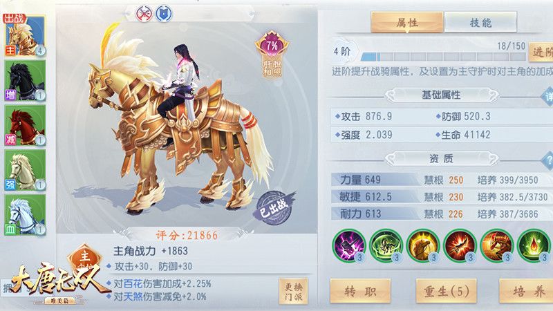 一匹优异的战骑资质由三部分组成,首先是战骑出生时自带的天生慧根属性;其次是融合其他战骑育种所带来的成长上限,慧根越高,上限也就越高;最后是进阶成长时所获得加成值。三者之间相辅相成,通过重生来重置慧根与技能,通过进阶道具来提升资质进阶成长,还有战骑外形的变换,毫不夸张的说战骑的培育其中的乐趣和钻研过程足以让玩家爱不释手。