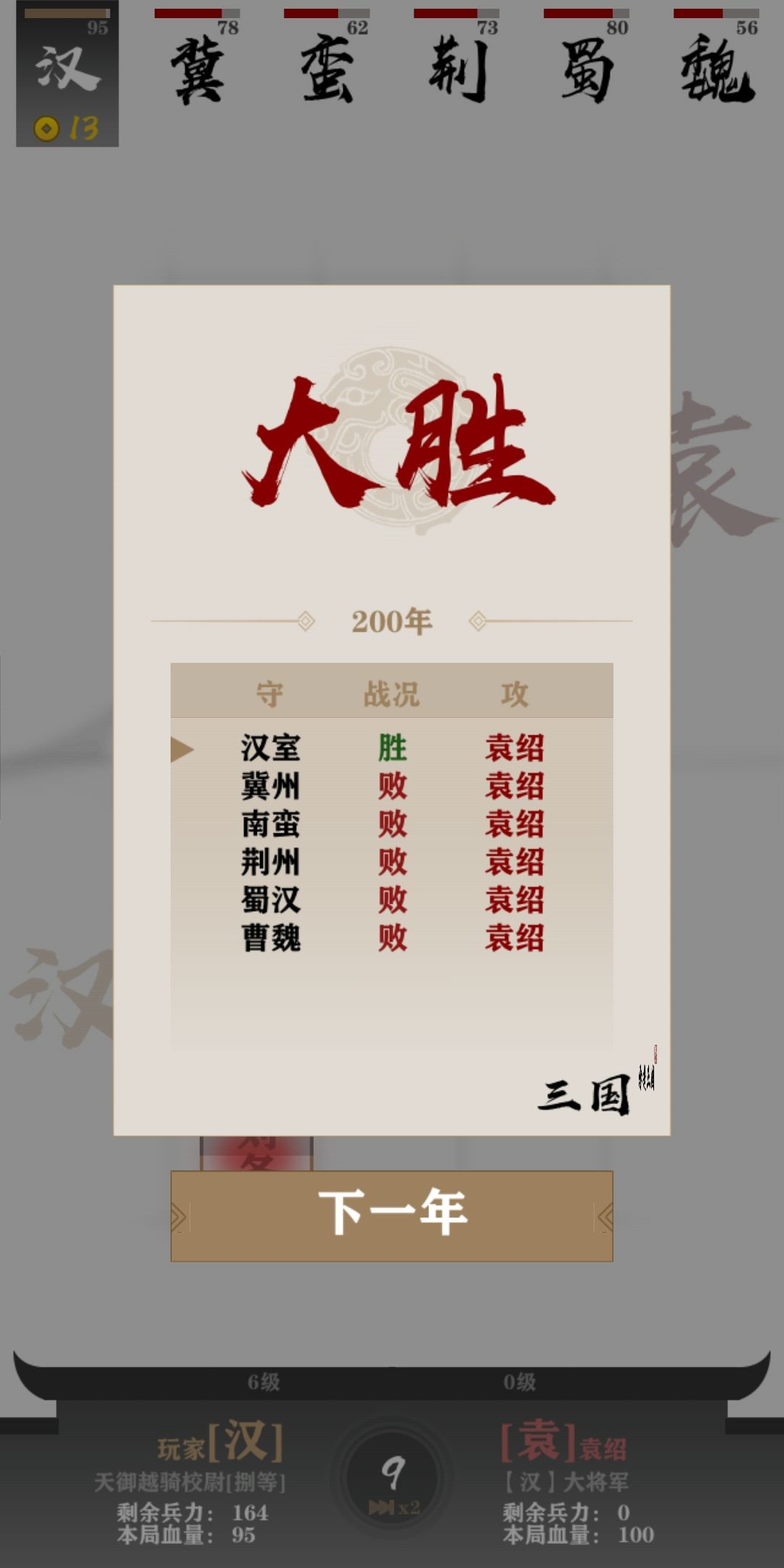 挺有趣的,简单又有策略性。一开始用的喜欢的曹公,后面发现好像蜀吴比较难一点,而且升级声望后难度貌似提升了(也可能当时没摸懂)。