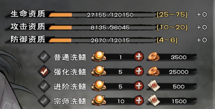 洗髓是一项非常持久的提升手段,资质上限随着等级提升而不断提高,非常难达到上限。提升速度稳定,并不会因为等级高了就增速变缓。土豪与平民的最大差别也就在洗髓,后期洗髓提供的战力也将碾压其他战力渠道,权重非常大。但之所以前期的性价比只给了三星,是因为普通玩家初期的铜钱产出,很难负担强化洗髓。江湖币也主要用于苗蛊残页的购买,洗髓丹也一样不足。