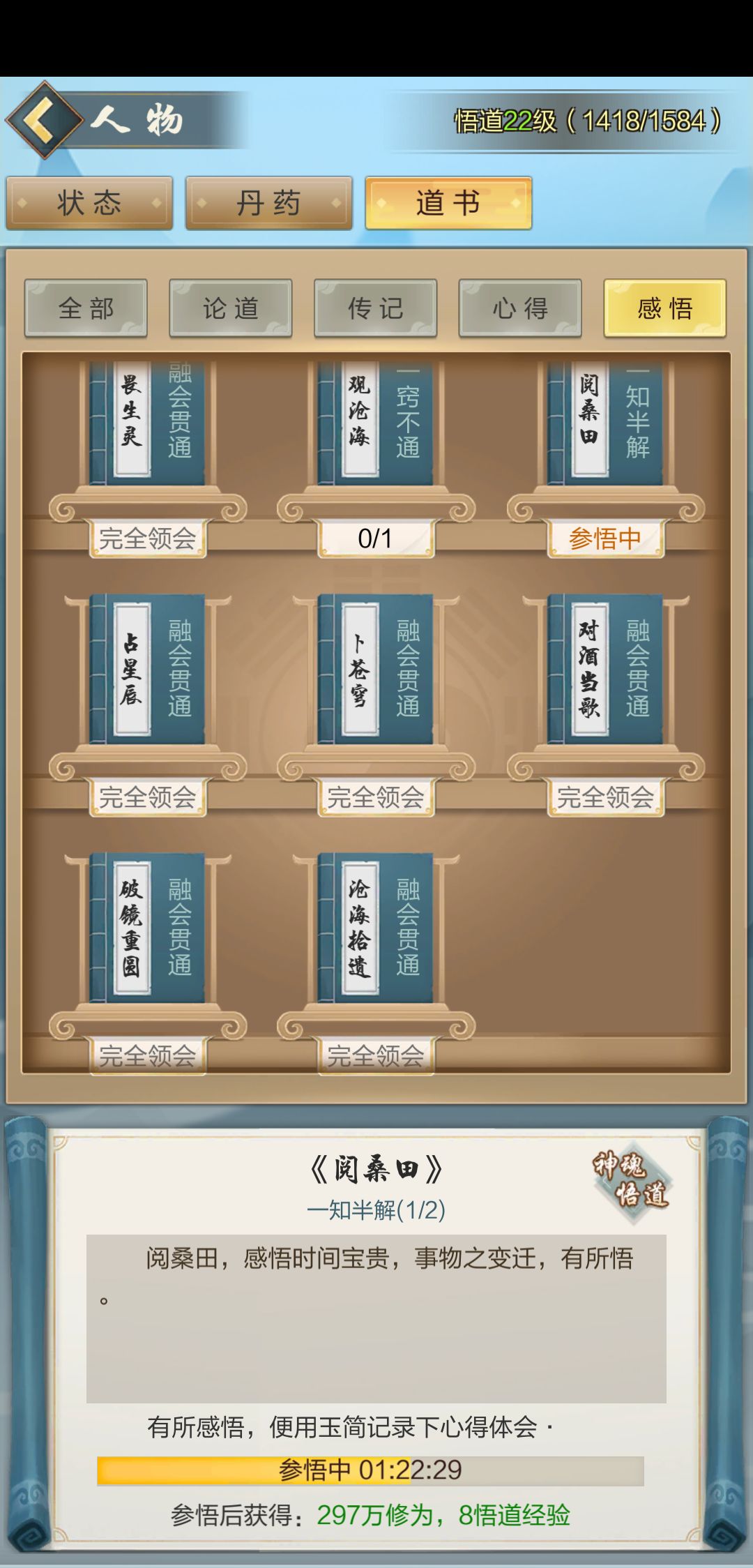 初读一本书总计可以获得:68点悟道经验,四类书所需时间如下: