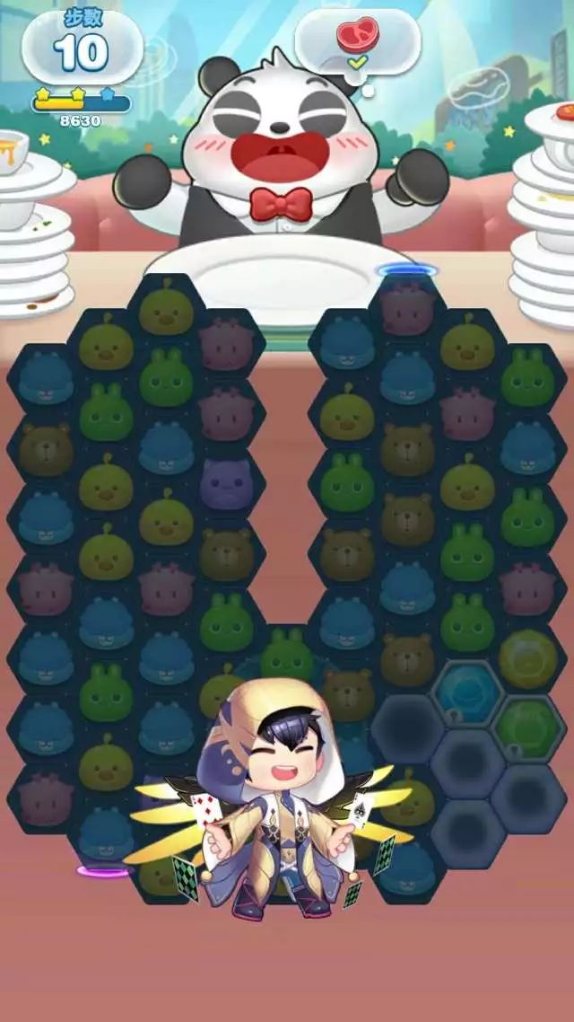 通过重重关卡,收集指定数量的物品,记得开始游戏时尽可能消除所需物品,期间尽量连取一些特效炸弹,直接使用或形成特效炸弹,就可以大面积清除障碍物,吃到烤肉啦!