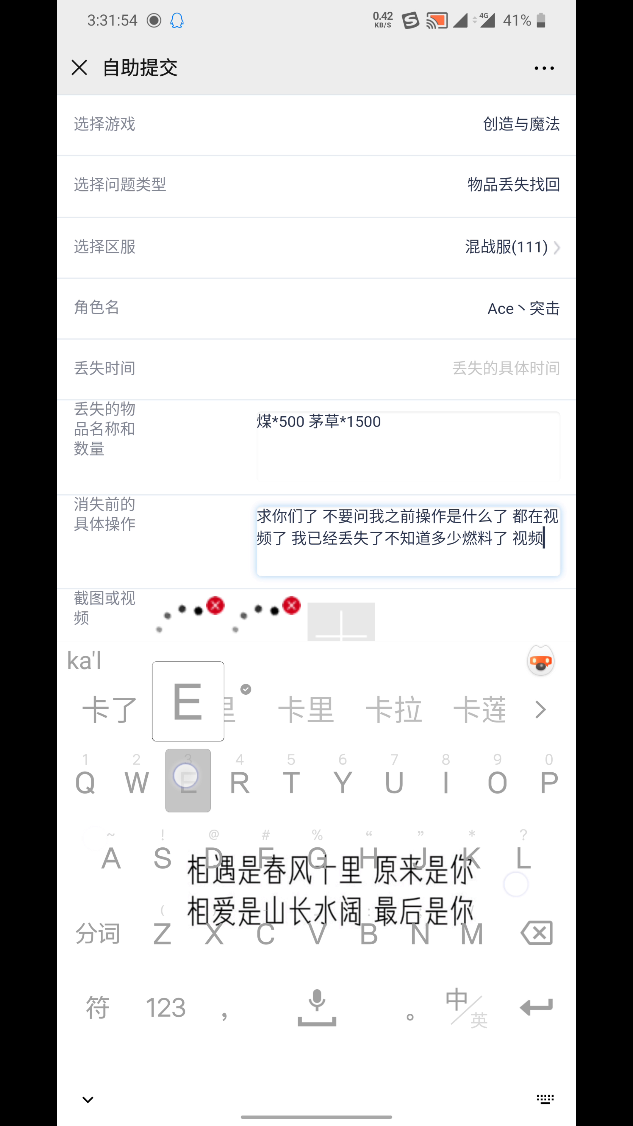 最气的是 之前可以提交的时候明明有视频 还要问我之前的操作 是也是醉了 好嘛 我也录了一下我从桌面进游戏接着放燃料进去的视频 (口吐芬芳)还提交不了 我气的很