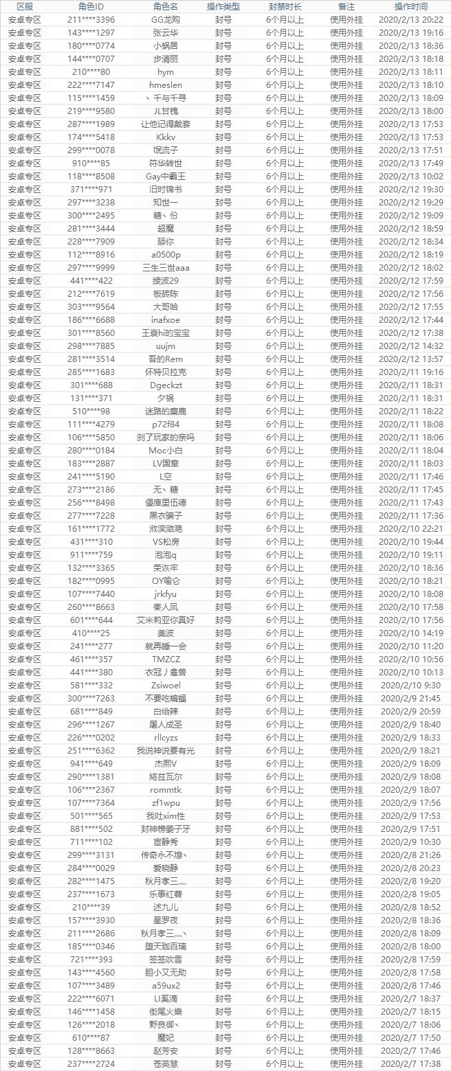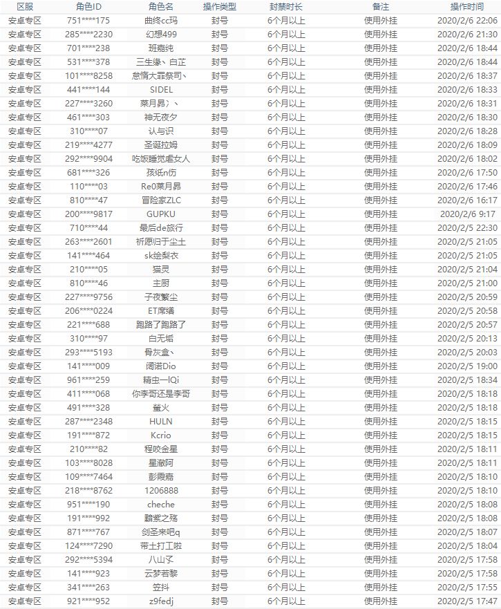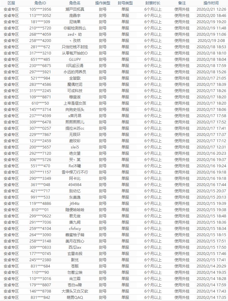 此次,我们将外挂封禁名单进行公开,对大家透明化,一是为了维护游戏的公平环境;二也是为了进行警戒。从本周开始,之后每周五会公布一次新增的外挂封号名单,也非常感谢向我们举报的玩家们。