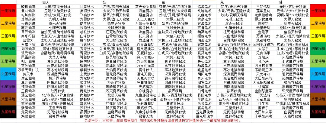 截止目前为止只有一种五星妖术,一种五星仙决尚未刷出,但已确定其掉落渠道,所以赶工完成了刷图推荐表以及掉落详情图,实在是马上要养功德树了功德负担有点大,秘境刷不起了......