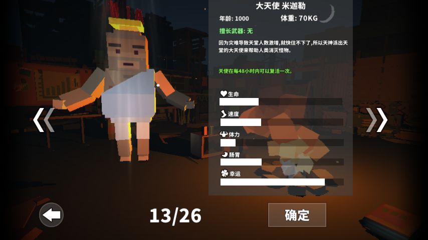也不说什么了,如果要评价大天使的话就一个字:拽!先不看其它面版属性,就那隔两天免费复活一次的技能,完全是其他角色望尘莫及的,幸运值也是最高的,缺点是速度比不过同样奔跑时作飞行的吸血鬼,体力耐久也不行,较为依赖功能饮料,和其他速度较慢的角色一样,比较怕粘液系列的丧尸,最好先把减速的清理掉,吃一个罐头能支撑22个小时,然后附上一张大天使的属性图:
