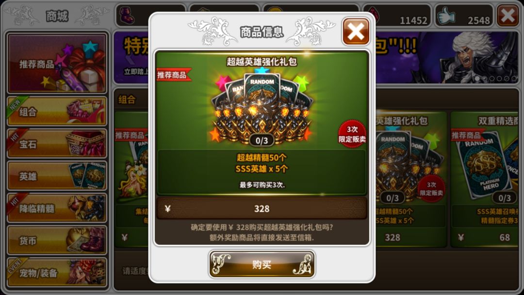 ☛ 精髓选择券30张+SSS英雄召唤券x1(限购买3次)