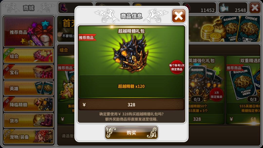☛ 超越精髓x50+SSS英雄召唤券x5(每周限购买3次)