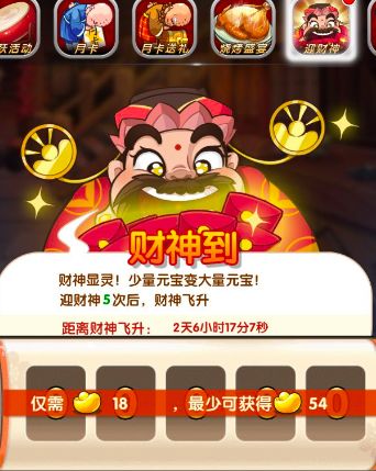 获得这些小家底以后,一定要记得先参加迎财神活动,这个活动能让你快速大量的增加元宝,如果你忘记点迎财神就把元宝消费掉了,实在是一笔大亏的生意。