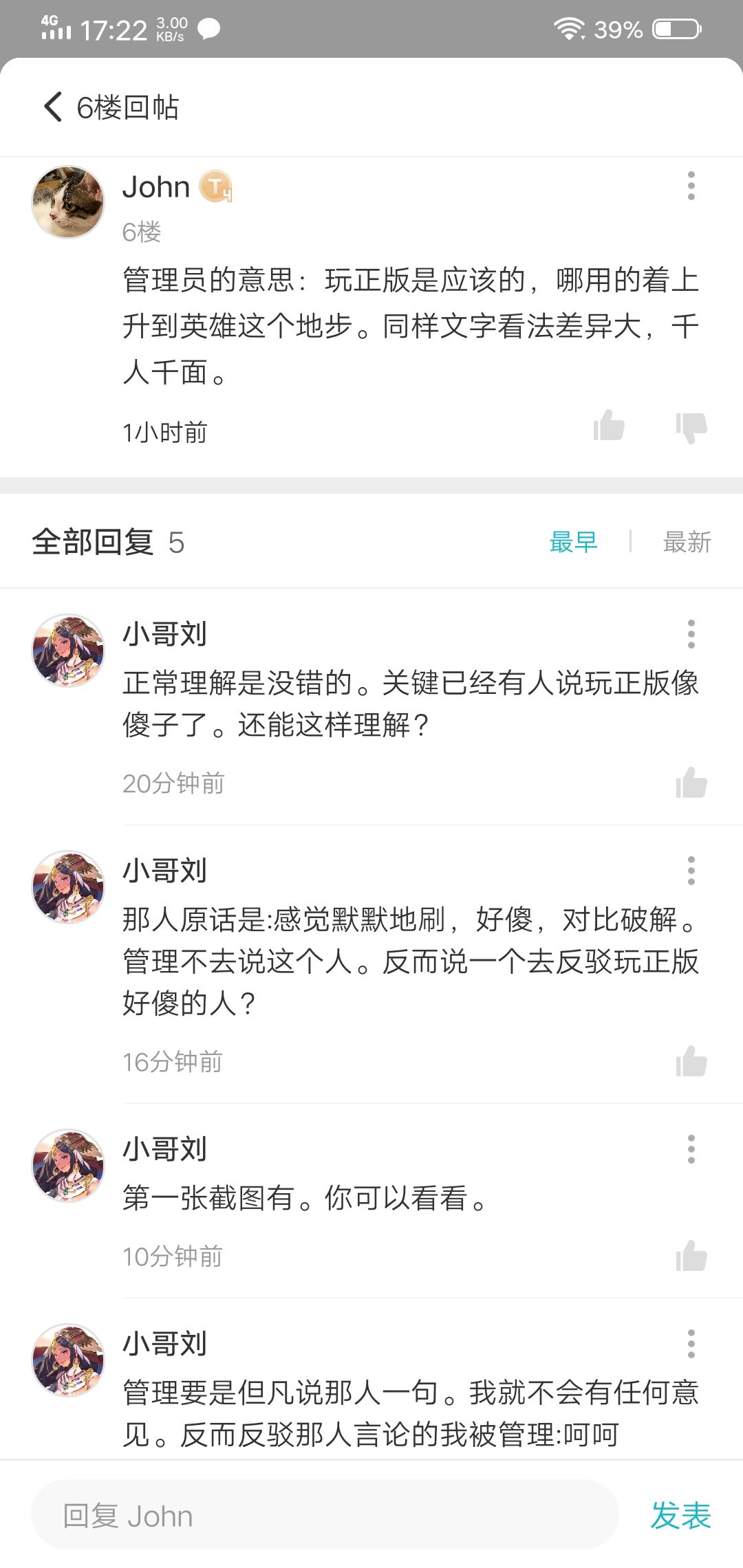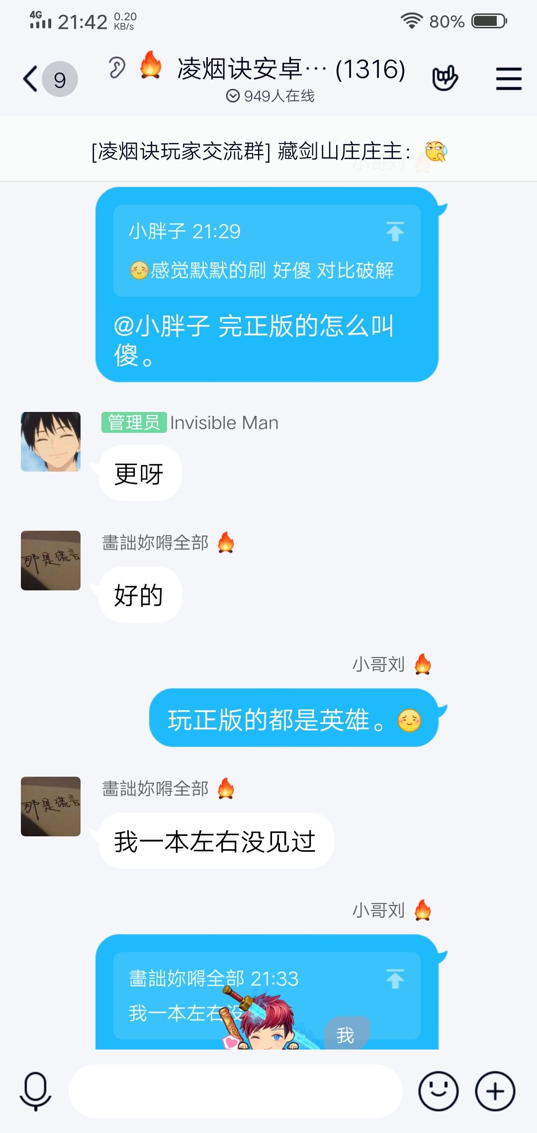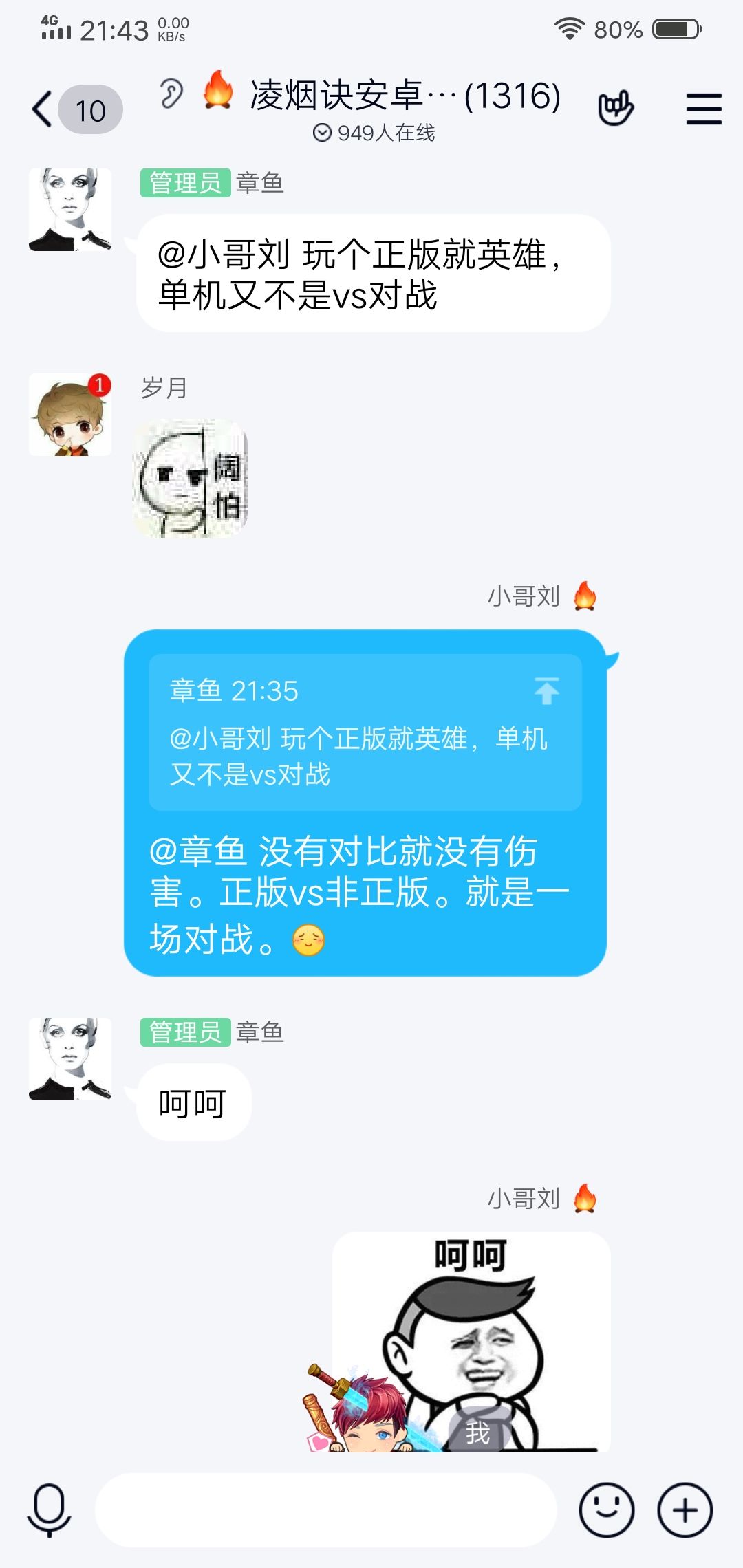 官方群里有玩家说玩正版的都是傻。作为正版玩家我当然看不下去。就回复那个人说玩正版的怎么会是傻。明明是英雄。这时候管理就出来了。@我 玩个正版就英雄,单机又不是vs对战我就回他 没有对比就没有伤害。正版vs非正版。就是一场对战。这时候管理给我来了两个字 呵呵!!!!!!!!!!