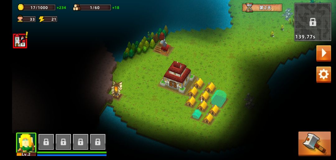 俩房子开局,第一次跳钱速出伐木。英雄沿着边往上清。依次出能量塔,风电,第一波怪下个木桩截兵。第二波怪来之前建一个火炮(掩护前面的那个能量塔),英雄继续清图。然后建第二个伐木。第二天一开始就可以起银行了。如下图。