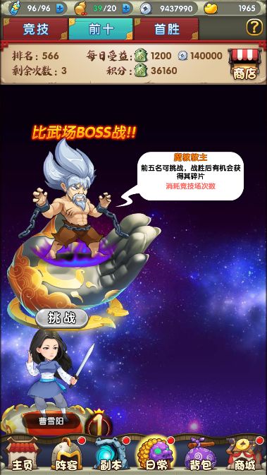 在竞技场中,每天可以挑战5次,你可以根据你的战力进行挑战,在挑战成功之后你就会获得积分,在每天积分累计到一定的数量的时候,每天的22点就会进行结算,获得大量的奖励,于此同时竞技场中会有不同的成就,主要是以名次进行分发奖励,你的名次排名越高,那么你的奖励就会越丰富,名次排名的奖励多数都是以元宝为主,名次越高,获得的元宝也会越多。而如果你能够把你的排名上升到前五名,那么你就可以挑战最终的大BOSS,如果你成功挑战这个BOSS,你就有机会获得这只强力BOSS的碎片,如此强力的角色协助你,还不快来挑战竞技场。