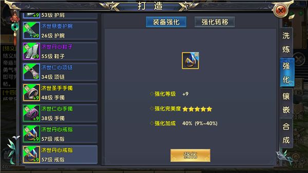 《卧虎藏龙贰》中,装备强化的最高等级随着人物等级的提升而提升,例如下图,人物等级57级,则装备最高强化至+9。