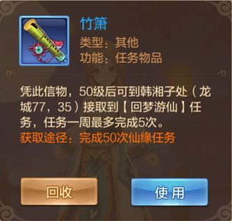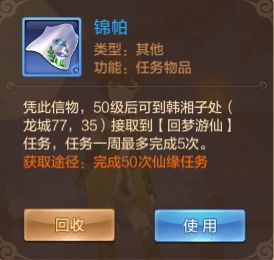 50级以上的宝宝,每完成50次仙缘任务,就可以获得特殊仙缘任务的道具:竹箫和锦帕中的一个,使用后会自动寻路到韩湘子处,与韩湘子对话之后可以接取到【回梦游仙】仙缘任务。