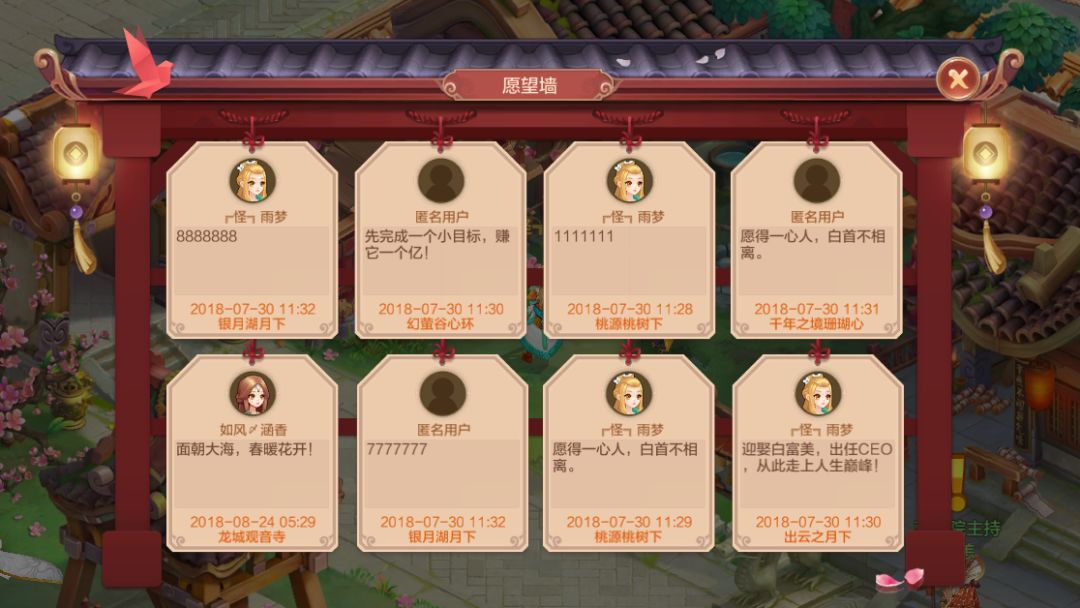 根据道具的说明到达指定的许愿地点后,只要使用福牌就会弹出一个许愿界面,愿望可以自己填写,也可以使用随机的文字。咳,宝宝们注意别许一些奇怪的愿望,因为,在祈福墙上可是阔以查看本服最新的8个愿望信息的!一不小心就被看到了!
