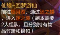 温馨提示:接取任务后,是不能单独完成仙缘任务的。而是要寻找到拥有另一种任务道具且接取了任务的宝宝,组队到NPC-迷之蝶处,对话后才可以进入任务副本继续任务。
