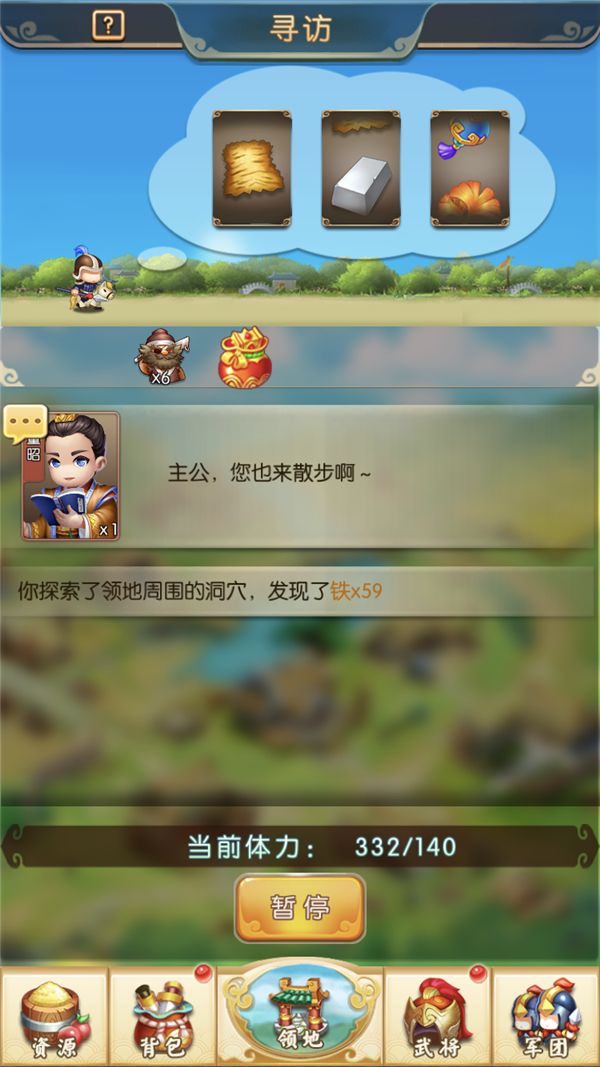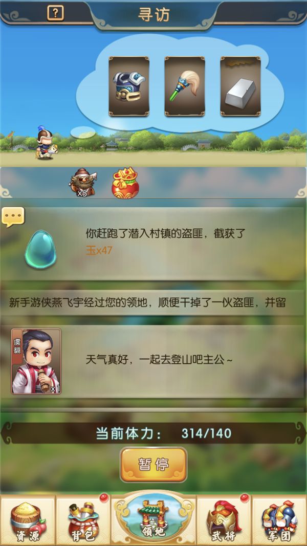 在领地寻访探索,可以遇到各种随机事件,得到资源,招揽武将,剿灭匪徒等,寻访自动进行,轻轻松松收获不少,经济实惠,无论新手还是老鸟,都是每天必做。那么寻访具体都能获得些什么呢?
