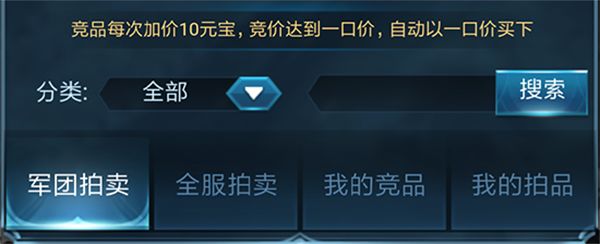 军团拍卖行顾名思义就是军团内部的拍卖。只有军团成员才可以在上面进行买卖,拍卖形式是价高者得。如果卖家设置了一口价,土豪就可以通过一口价将宝物收入囊中啦。若无设置一口价则是价高者得。大家都是一个军团的自家人,也可以卖卖人情商量着来~