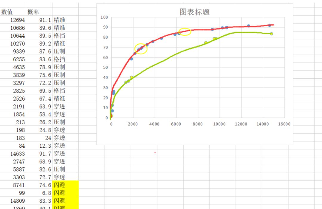 图中可以比较明显的看到,斜率在2500数值, 70%概率, 和7000数值, 86%概率开始减弱(黄圈所示),注意, 这里并不是说面板堆到2500/7000就够了,实战数据要减去对面相应的防御属性。随着等级的提高,收益递减的这个点也随之提高,每个级别都有一个性价比最高的“及格线”。