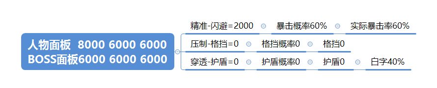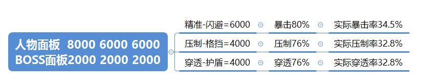 可以看到,当属性可以虐这只BOSS时,在圆桌原理下的压制和穿透反而会抢占暴击概率。然而不同难度BOSS的面板天差地别,我们再来看这只特训BOSS。这货防御三围直接飞了起来,6000 6000 6000