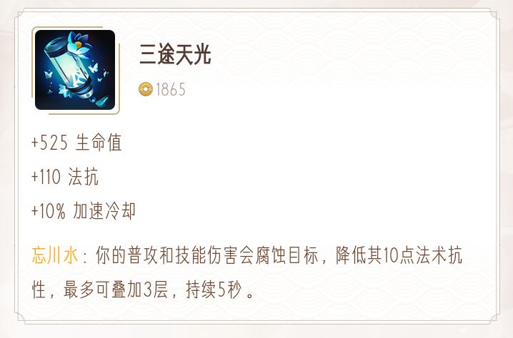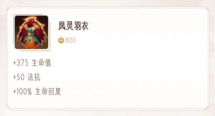 对比繁盛绯衣和九天穹之翼,这件装备虽然不比另两件肉但胜在有减魔抗这个效果。30点减魔抗可以让大招的伤害更上一层楼,同时也能变相增加己方法师的输出