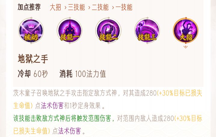 掉;第二这个技能没有任何加成,是的你没有听错。没!有!任!何!加!成!不管你出几把饮血几个爆竹攻击破千还是法强破万都没有任何卵用。它的伤害构成只有一个基础伤害以及一个斩杀伤害(因此不用费劲心思出纯输出妄想一个大招捏死满血);第三点是这个大招可以被躲避,妖刀的大、真天的大、鸩的大、咕咕的大(难倒是因为原形是鸟的式神会飞所以茨木的爪子够不到吗???),面对这些式神时需要注意他们是否已经释放过这些闪避技能了