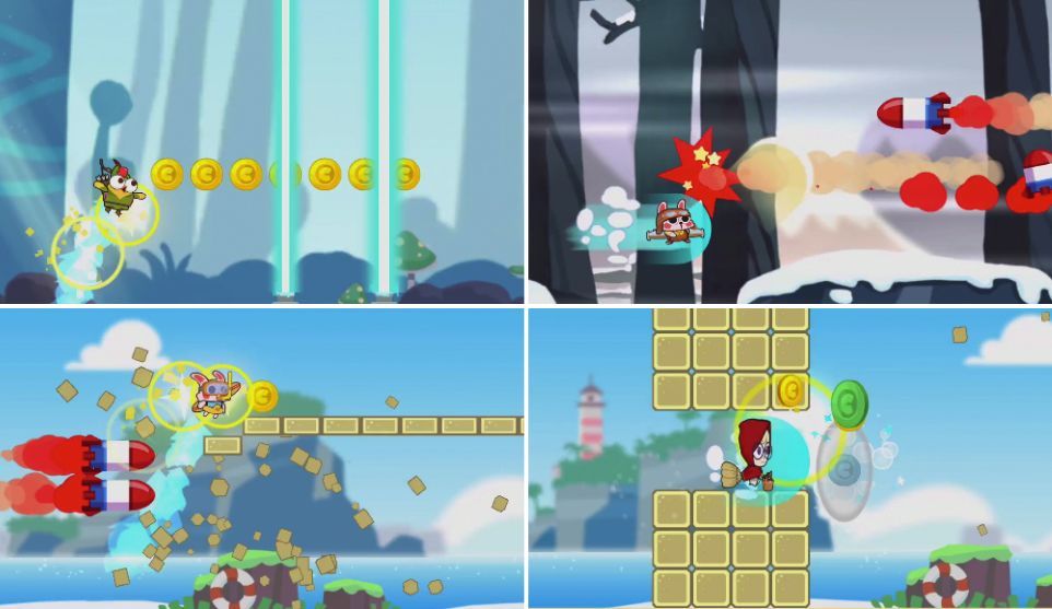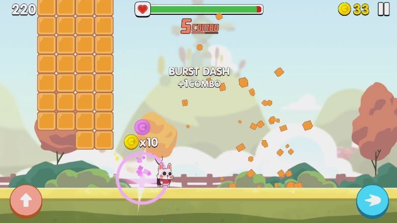 《暴走兔子》中只有两个按键:冲刺和上升,分布在屏幕的左右半边,你则要操纵一只兔子,不断去破坏路上的一切物品。