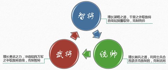 《三国奇兵》是一款极具策略性与经典性的三国策略游戏,这里有最具策略的游戏玩法等主公来体验。首先,了解一下游戏内的武将职业,游戏中将领分为3大职业:武将、智将、统帅,每个职业都有各自的职业特性,并存在相互克制的关系,可观看下图进行参考: