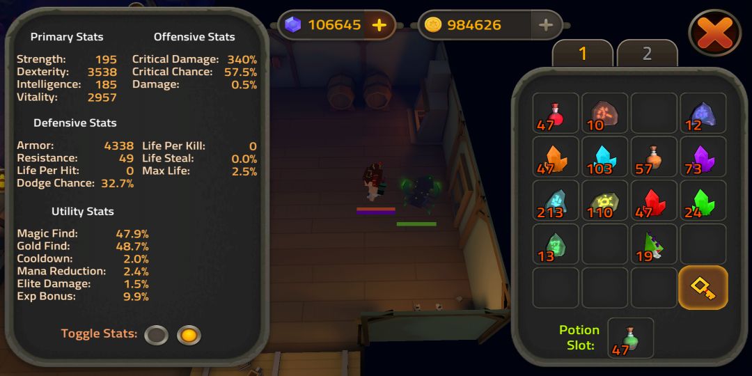 装备武器主弩全是敏捷血量+暴击爆伤可惜就2件暗金还是没孔的。宠物没啥用,而且。bug超级多。裂缝空间最多打到19阶段也就是花费40w进去,里面没那么多怪进不了boss房间你说郁闷不郁闷。