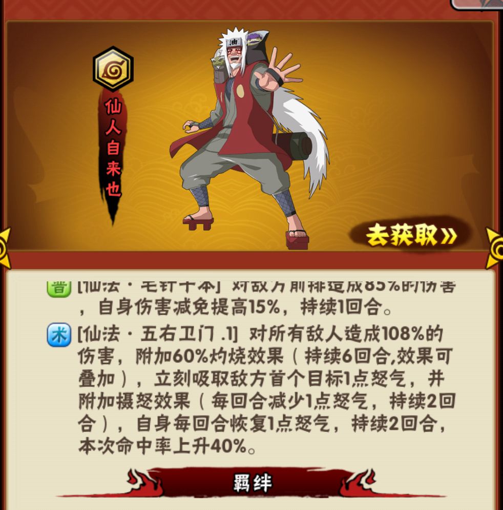 仙人自来也技能伤害太低!百分之一百零八!灼烧百分之六十!要求仙人自来也技能伤害增强到百分之一百五十九!灼烧效果降低到百分之三十五!