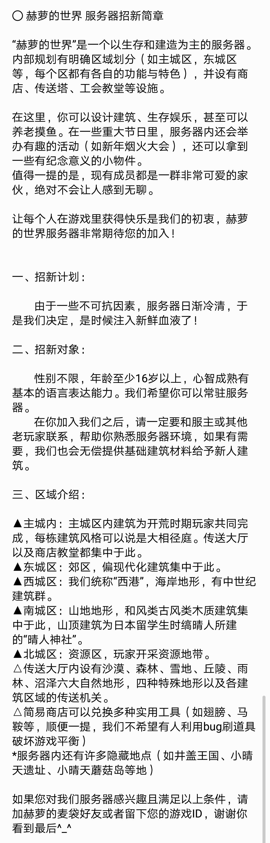 欢迎各位新人加入我们 无论是初次接触这类游戏还是第一次玩服务器的萌新 还是不喜欢说话一个人在服务器玩单机的神秘人 还是每天肝到黑的建筑/生存大佬 我们都无比希望能和你们一起度过哪怕短短几个月甚至几天的时光 每一位存在过在服务器的玩家都会被记录到博物馆中 只要您看完介绍后觉得还不错有意愿玩玩 请留下您的ID 或者游戏中添加一下赫萝的麦袋 我们会第一时间联系您(゚⊿゚)ツ!