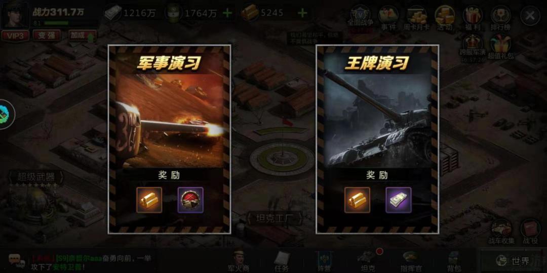 5.军演(军事演习只是第一次挑战名次后送金砖,重点是王牌演习,每天都送排名相应金砖)
