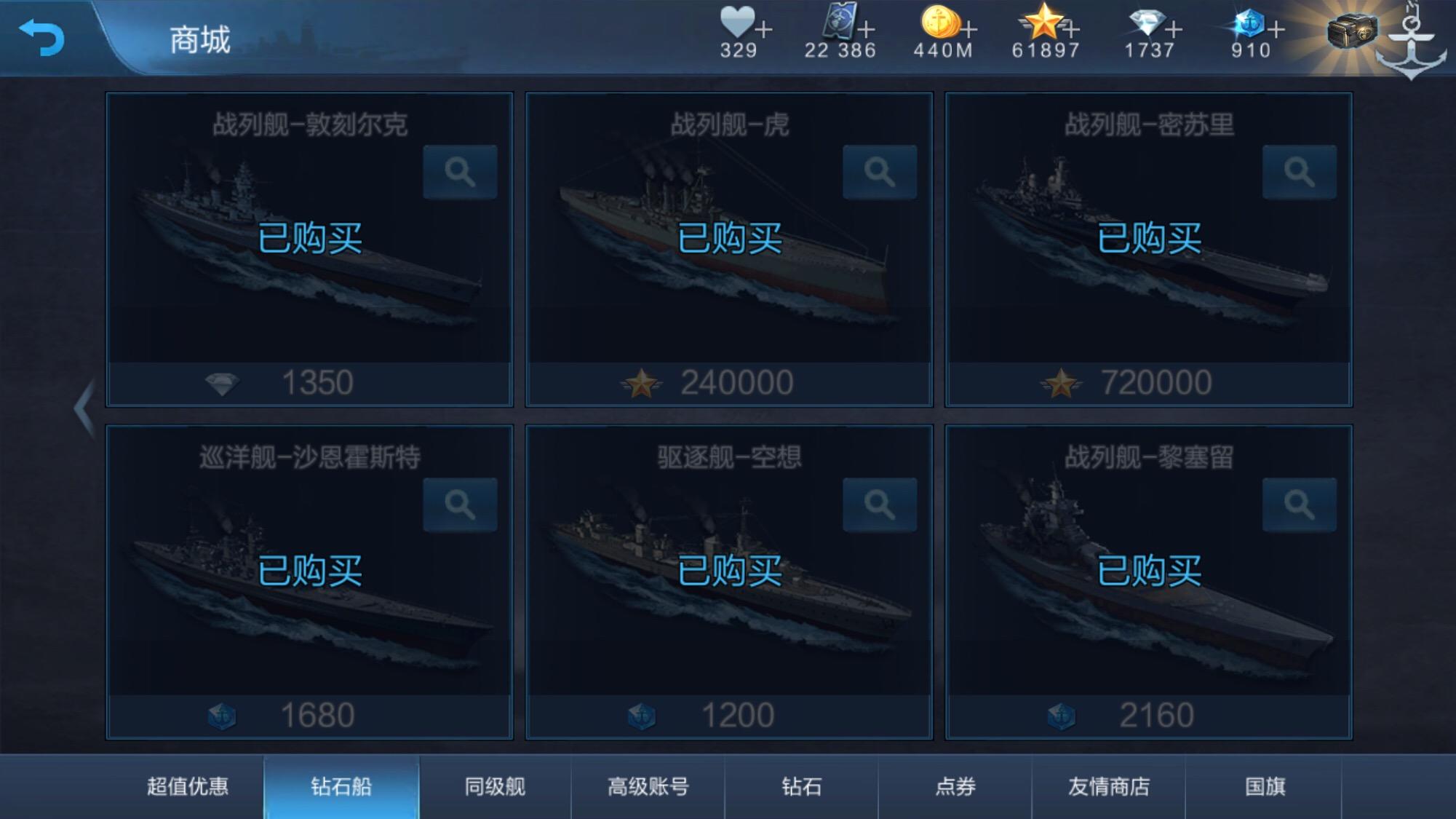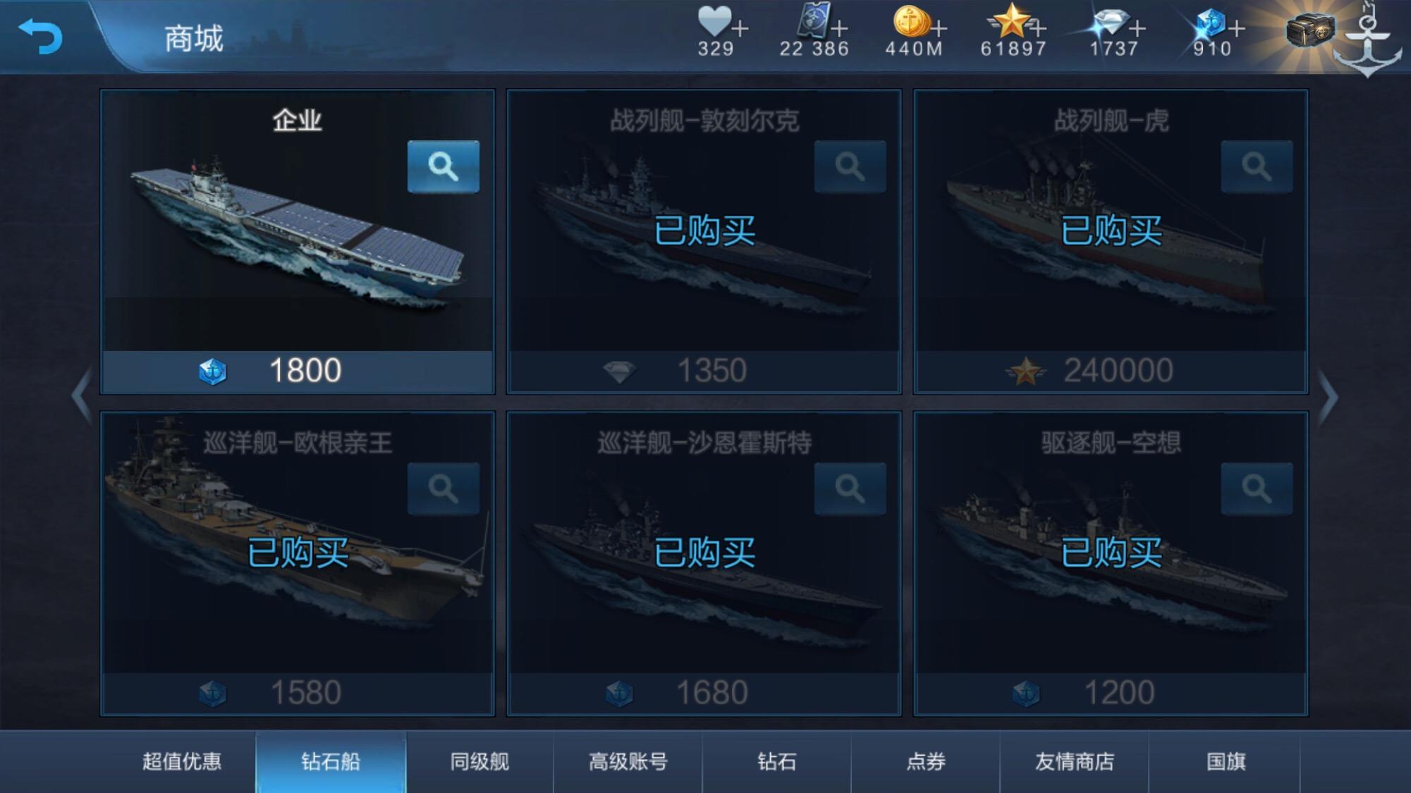 沙恩,欧根,黎姐,空想,定远礼包,前4个钻石首充,一张月卡,两个每日自由经验,三个点券限定礼包,建军节礼包,20级礼包,还剩910点券