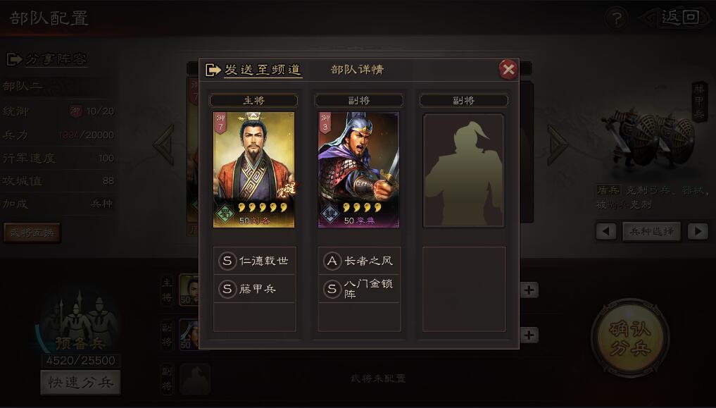 此时只要屯好资源升8级主城,然后升级3级帅令坛,将统率提升至20,桃园队即可成型了。桃园队对于S2来说,还是属于T1队伍,由于刘备张飞的存在,其稳定性高,爆发就看关羽的战法释放情况。总体来说,还算是比较厉害的队伍,队伍过渡也比较平稳。