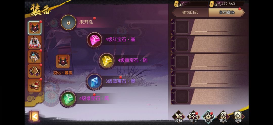 铭切: 一套四级铭切是必备的 四维的选力量 攻击的选基础攻击不要选破防攻击 白虎选暴击其他选爆伤 属强不要全属强选自己要堆的那个