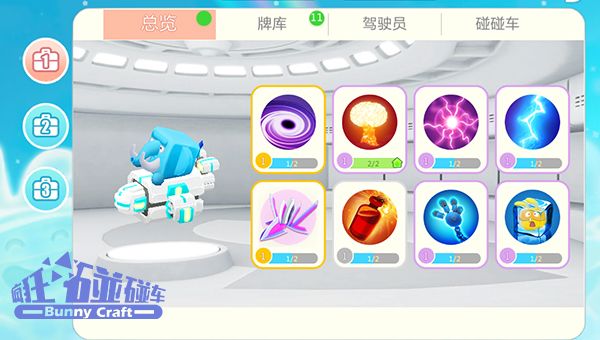 《疯狂碰碰车》的技能系统有些类似卡牌游戏中的卡组,每一辆碰碰车都可以装备8个技能卡牌,在这个卡组中,玩家能同时抓在手里的只有3张,每打出一张牌,就可以立即从卡组里获得一张补充,但要打出这张刚补充的手牌,仍需要等待几秒CD冷却时间。